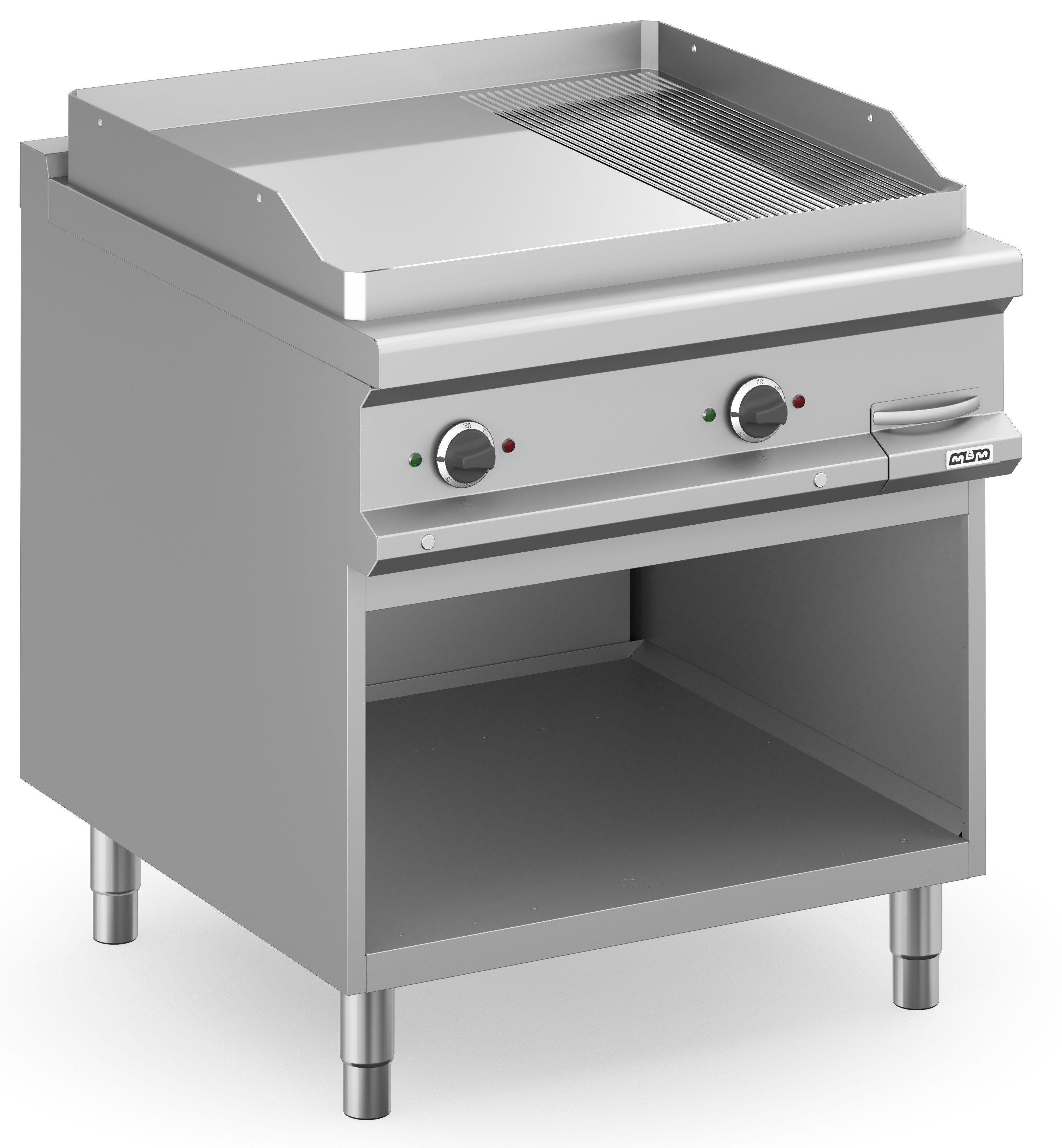 • La placa de cocción totalmente encerrada en la encimera de trabajo está hecha de acero dulce, con acabado pulido o en cromo duro, y tiene espesor de 15 mm.